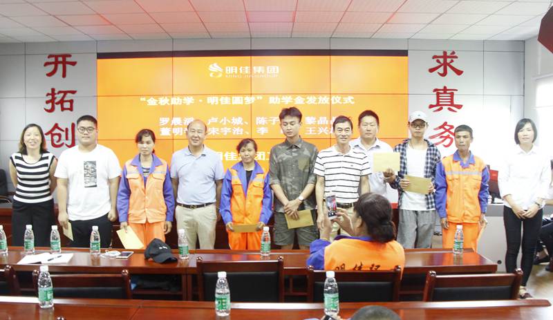 8月28日上午,明佳集團(tuán)工會(huì)“金秋助學(xué)·明佳圓夢(mèng)”助學(xué)金發(fā)放儀式在集團(tuán)公司三樓會(huì)議室舉行,為8個(gè)考取大學(xué)的職工子女發(fā)放助學(xué)金共計(jì)9600元?偛藐愒啤⒏笨偨(jīng)理鐘寒參加發(fā)放儀式,儀式由工會(huì)主席高斐斐主持。