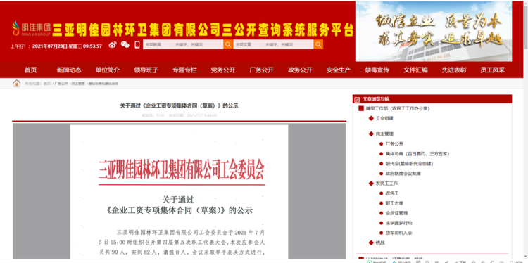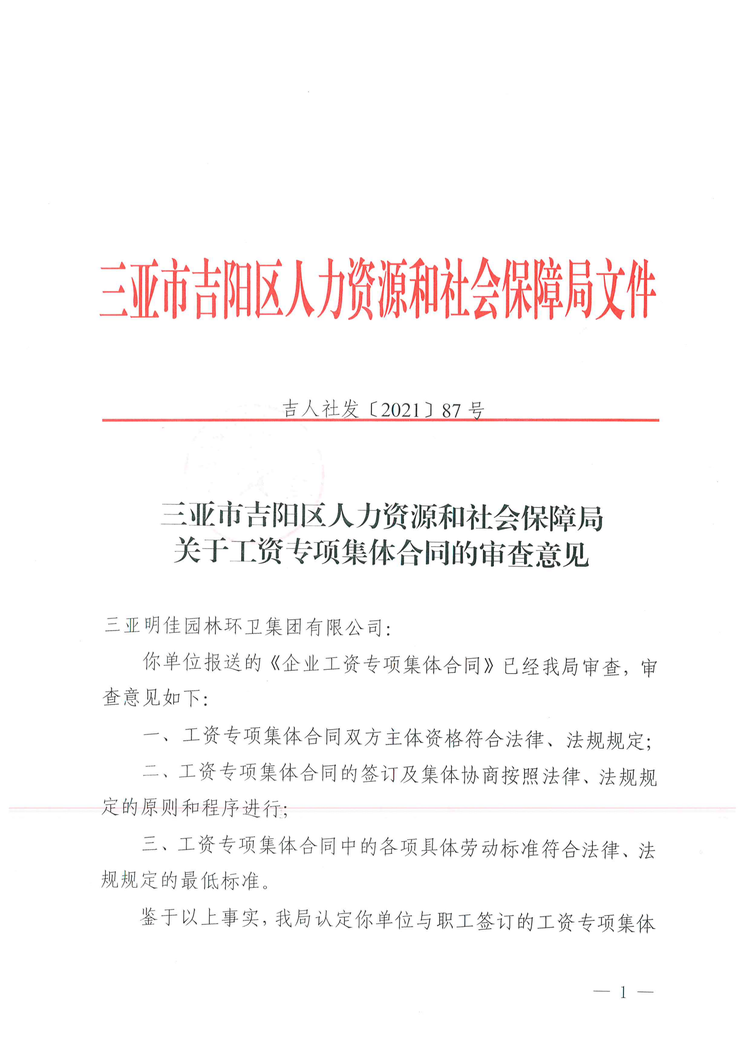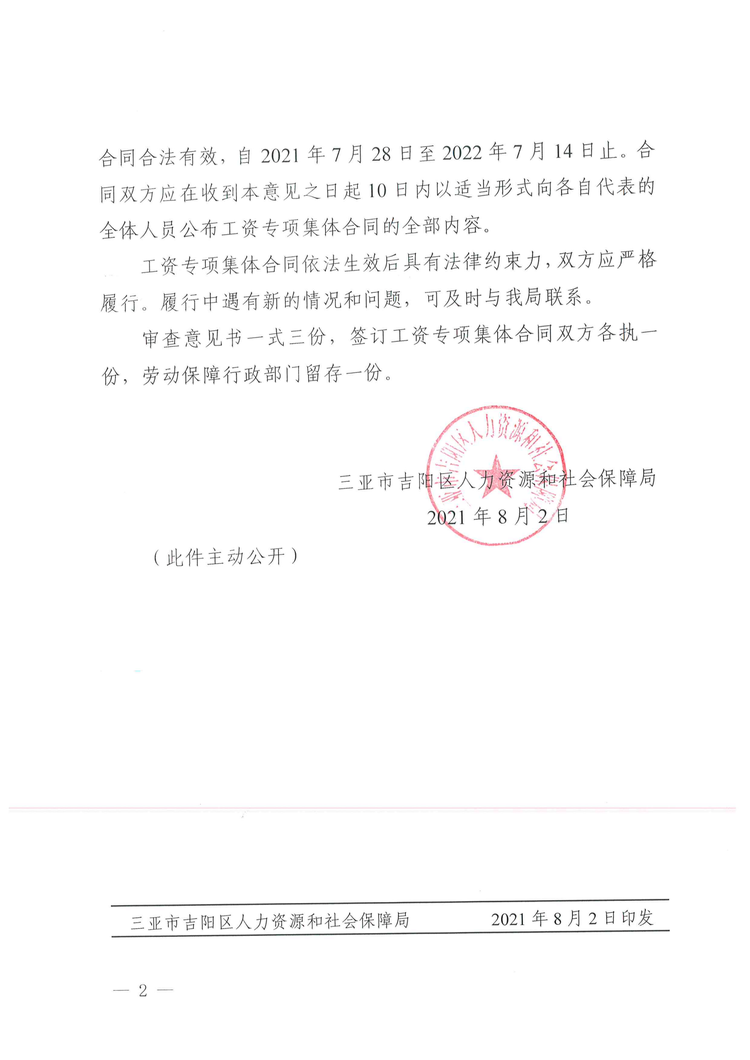 2021年8月2日,吉陽(yáng)區(qū)人社局審查通過(guò)我公司《企業(yè)工資專項(xiàng)集體合同》。8月4日?qǐng)?bào)三亞市總工會(huì)基層工作部備案。至此,三亞明佳園林環(huán)衛(wèi)集團(tuán)有限公司2021年度企業(yè)工資集體協(xié)商工作圓滿結(jié)束。