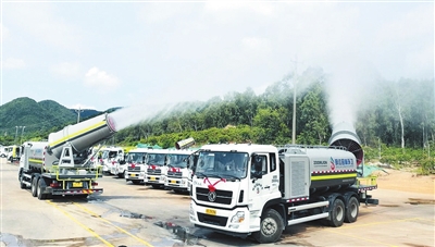 5月9日,三亞新增的21輛新型環(huán)衛(wèi)車同時亮相,整裝待發(fā)。圖為兩輛多功能抑塵車現場展示噴霧抑塵功能。